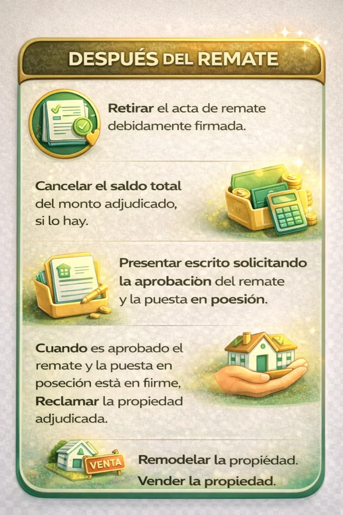 12. Cuando es aprobado el remate debes trapasar la propiedada a su nombre.13. Cuando es aprobada la puesta en oposeción debes recalamar la propiedad.
